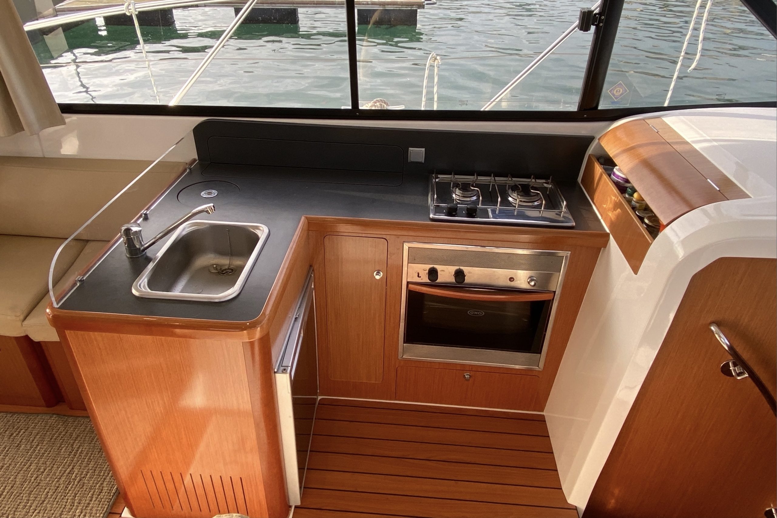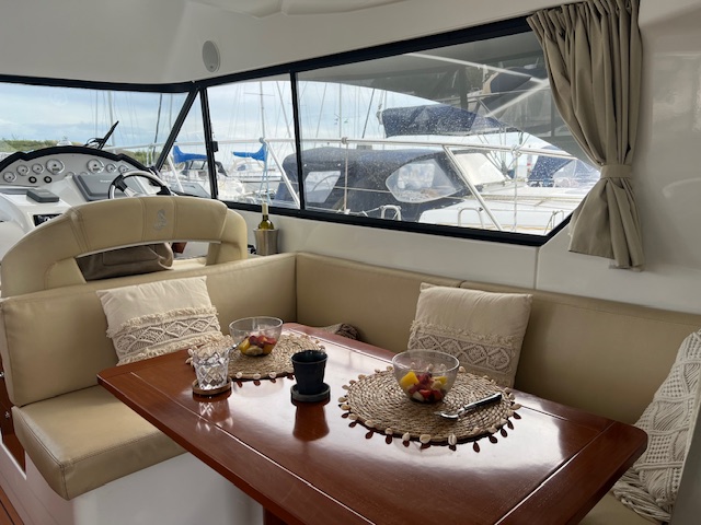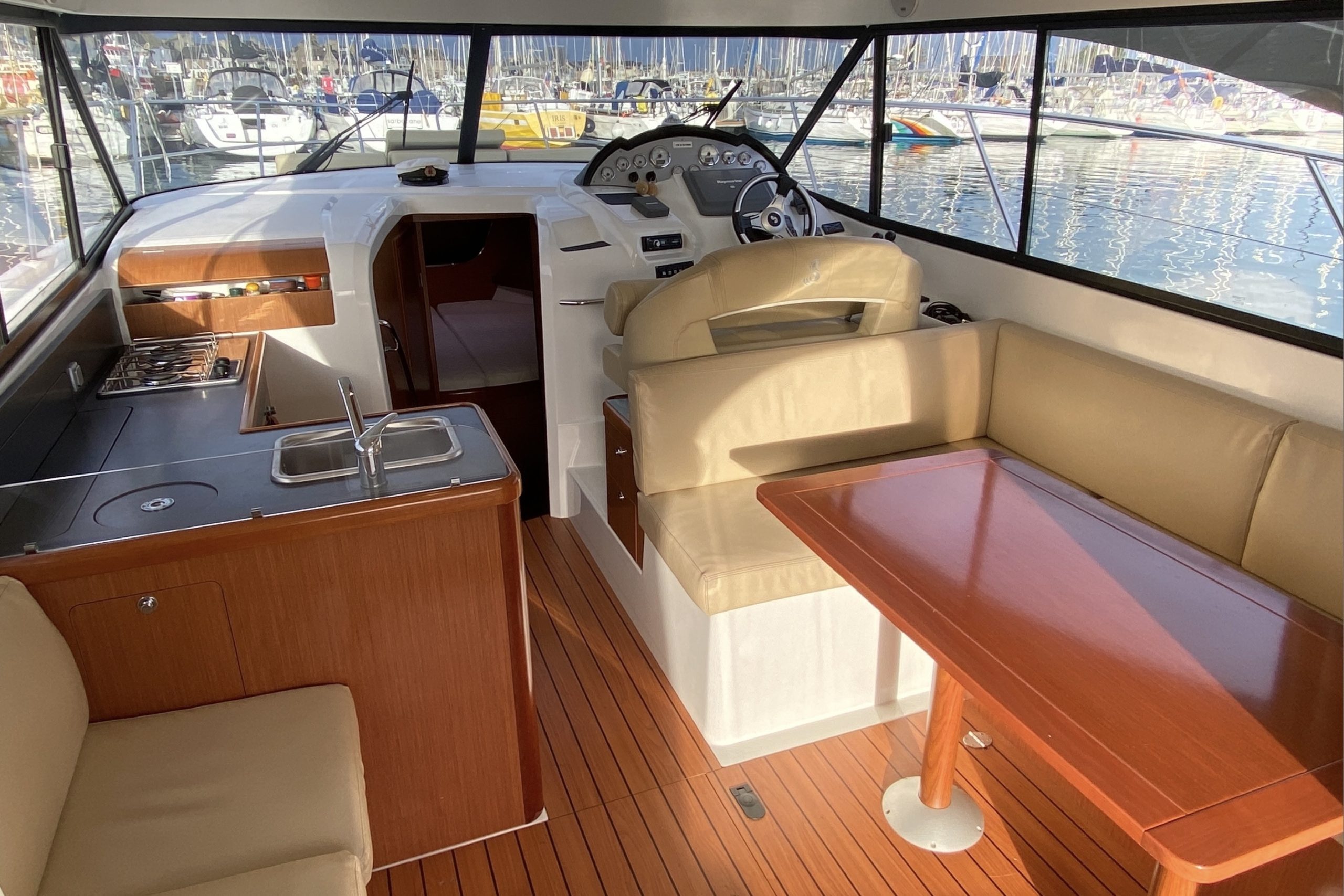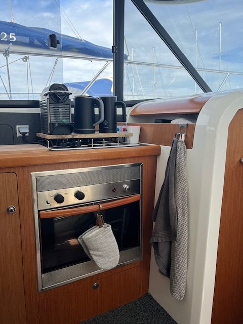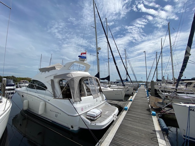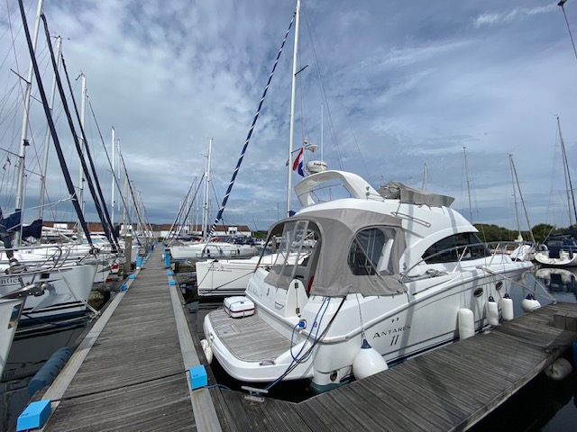 Groot teak zwemplateau. Ruim achterdek met zitje en trap naar Flybridge. Royale binnenruimte met glazen schuifdeuren en schuiframen (met gordijnen) met zitplaats voor 6 personen, tafel, stuurpositie met 2 zitplaatsen, keuken met koelkast met vriesvak, oven en kookstel met 2 pitten. Nespresso apparaat en waterkoker. Verder een Cd/radio speler. Ingang naar binnenruimte, Benedenruimte met trap naar beneden, slaapkamer met tweepersoonsbed (180 x 200) of 2 aparte bedden, Masterbedroom met tweepersoonsbed (150 x 200) en een 3 inch tv met ambilight. Badkamer met toilet en wastafel. Er is een losse bluetooth speaker van JBL voor streaming muziek. Er zijn usb oplaad mogelijkheden aan boord. Voordek met zonnebed (180 x 220). Boven op de boot bevindt zich een riant Flydeck met een geweldig uitzicht over de haven!