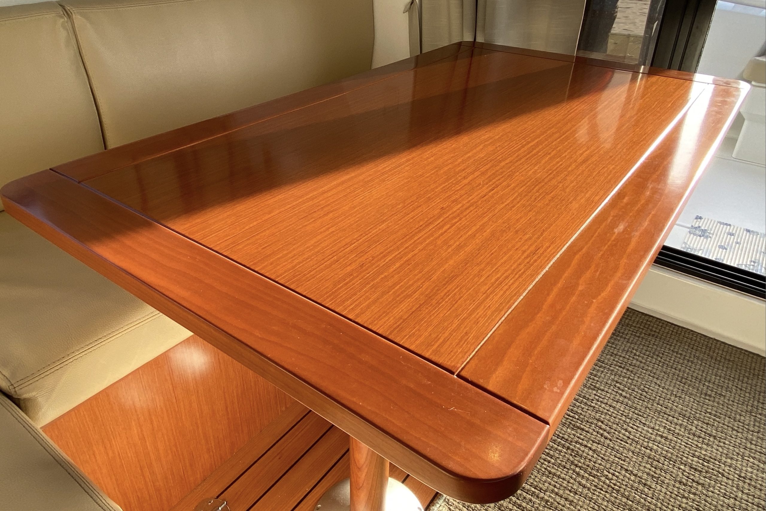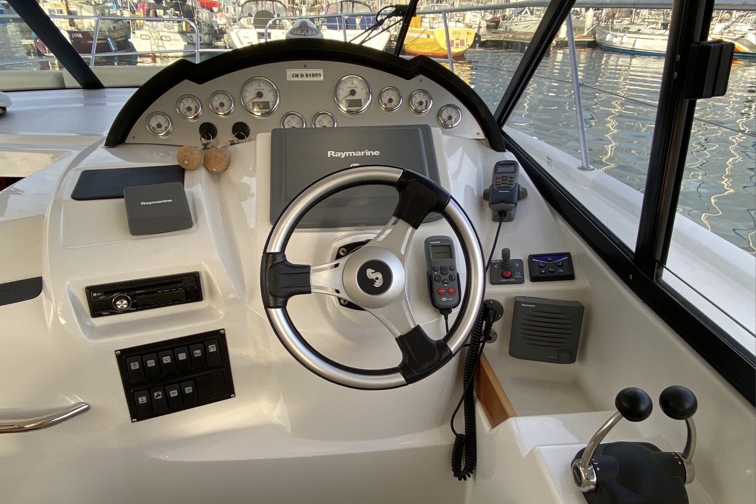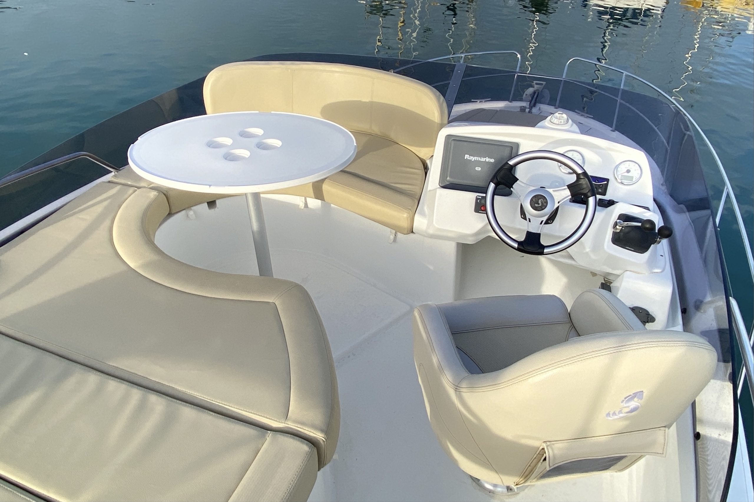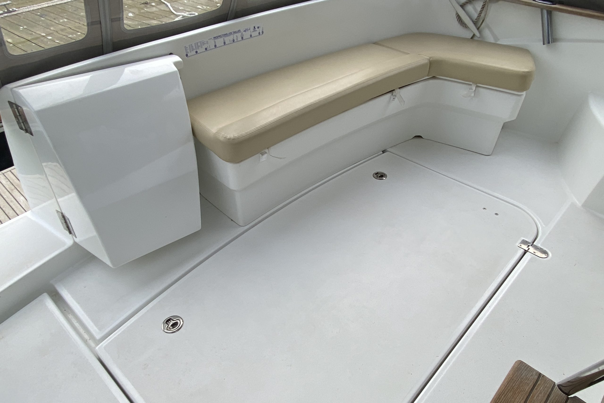 Groot teak zwemplateau. Ruim achterdek met zitje en trap naar Flybridge. Royale binnenruimte met glazen schuifdeuren en schuiframen (met gordijnen) met zitplaats voor 6 personen, tafel, stuurpositie met 2 zitplaatsen, keuken met koelkast met vriesvak, oven en kookstel met 2 pitten. Nespresso apparaat en waterkoker. Verder een Cd/radio speler. Ingang naar binnenruimte, Benedenruimte met trap naar beneden, slaapkamer met tweepersoonsbed (180 x 200) of 2 aparte bedden, Masterbedroom met tweepersoonsbed (150 x 200) en een 3 inch tv met ambilight. Badkamer met toilet en wastafel. Er is een losse bluetooth speaker van JBL voor streaming muziek. Er zijn usb oplaad mogelijkheden aan boord. Voordek met zonnebed (180 x 220). Boven op de boot bevindt zich een riant Flydeck met een geweldig uitzicht over de haven!